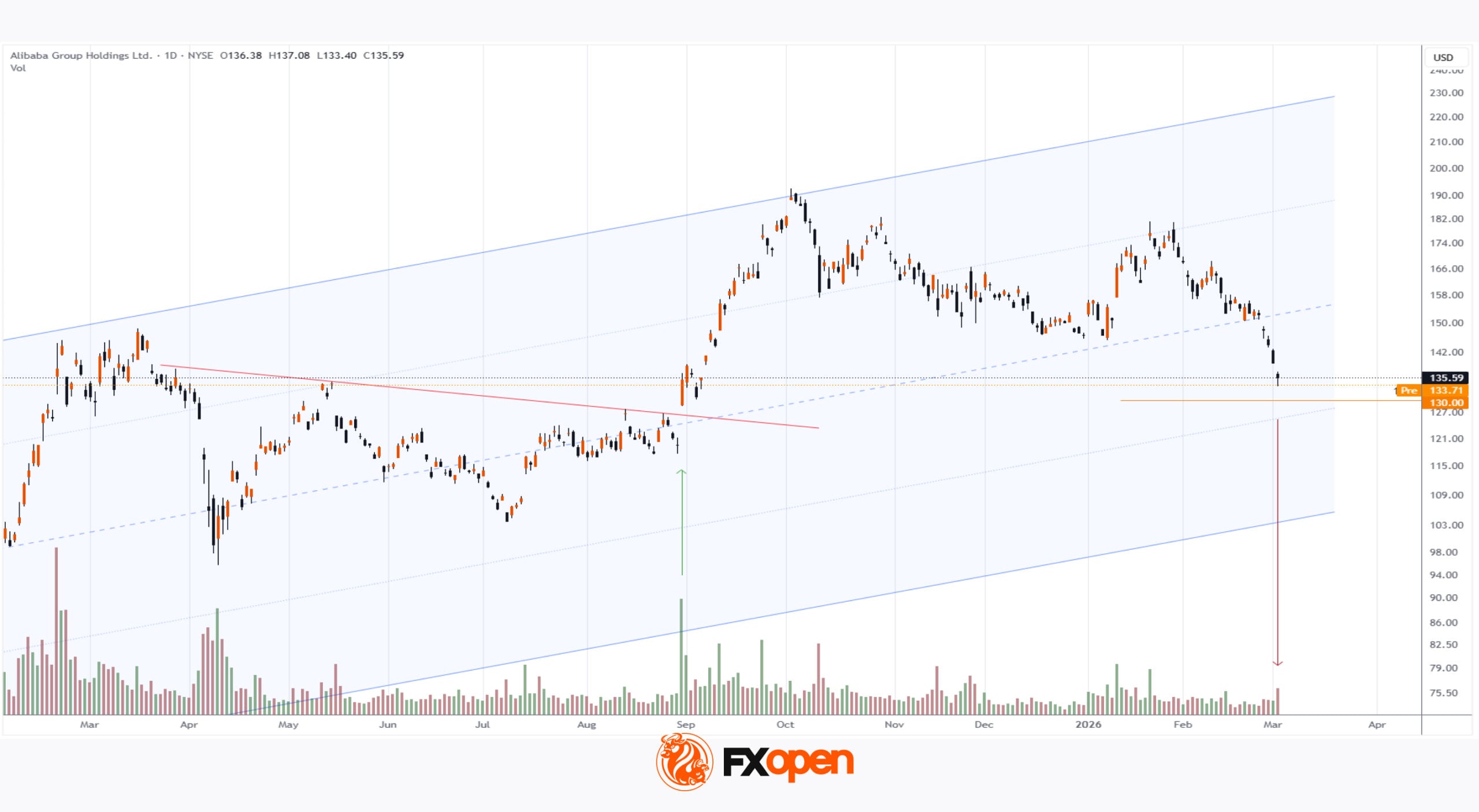 Alibaba (BABA) shares closed at $152.28 last Wednesday, dropping to $135.59 yesterday, marking the lowest level for 2026.